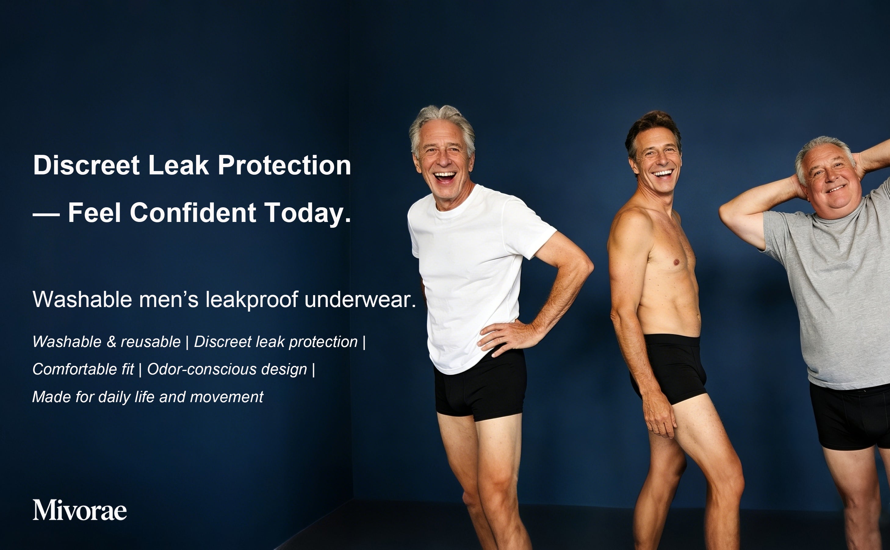 These boxer briefs are engineered specifically for light to moderate incontinence, with a maximum absorption capacity of 150 ml. They’re ideal if you experience occasional urinary leaks, post-void dribbling, or stress incontinence triggered by physical activities such as coughing, sneezing, laughing, or exercising. Thanks to our bamboo fiber absorption technology, they keep you dry for hours on end while staying discreet and comfortable, just like your everyday underwear.